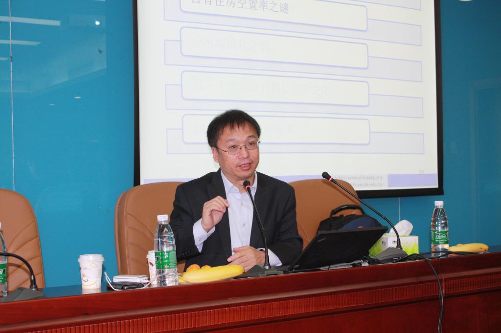 2014年11月6日下午,必赢766net手机版邀请到知名学者甘犁教授来我校交流,在学术会堂702为我校师生带来了题为“中国自有房空置率之谜”的专题讲座。讲座由必赢766net手机版院长李涛教授主持,教务处副处长张苏、必赢766net手机版副院长陈斌开以及来自我校各个学院的十余位教师出席了讲座,讲座还吸引了两校区数十名硕博学生参与,讲座现场气氛热烈,座无虚席。