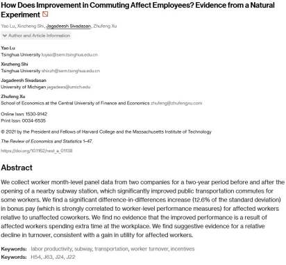 在这项研究中,研究者收集了在北京市清华东路西口地铁站附近两家公司长达4年的员工层面的月度人事数据。该地铁站在样本期中段开通,使得部分员工的通勤状况在此之后有了极大的改善。运用双重差分设计,并结合企业人事数据和调研数据,研究者发现通勤状况改善的员工,他们的奖金出现了显著的提升(约占12.6%的标准差),并且奖金是与员工绩效高度相关的。研究者没有发现任何证据,证明这种绩效改善是由于员工在公司内花费了额外的工作时间。研究者发现了一定的证据,表明通勤改善员工的离职率有所下降,这与交通改善能带来效用提升的理论预期一致。
