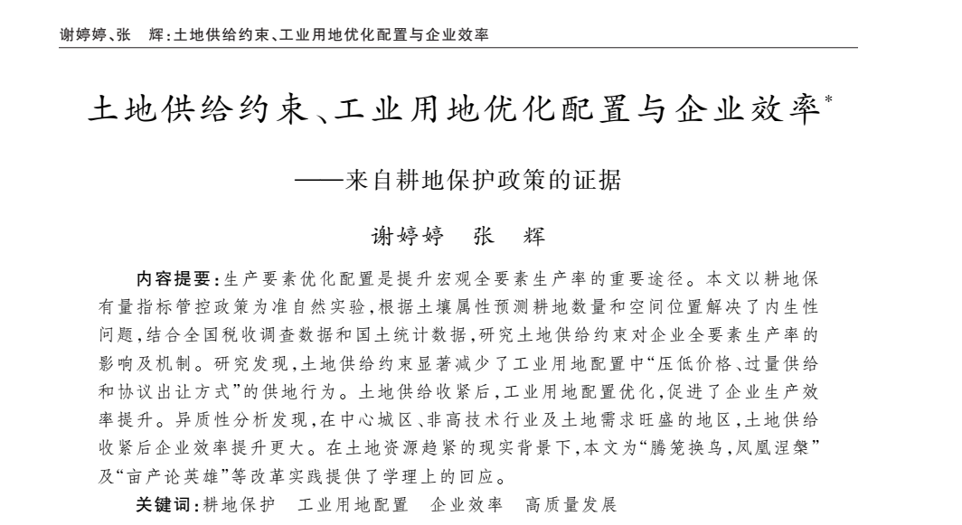 更多精彩内容请查看原文:谢婷婷,张辉.土地供给约束、工业用地优化配置与企业效率——来自耕地保护政策的证据[J].经济研究,2024,59(05):190-208.