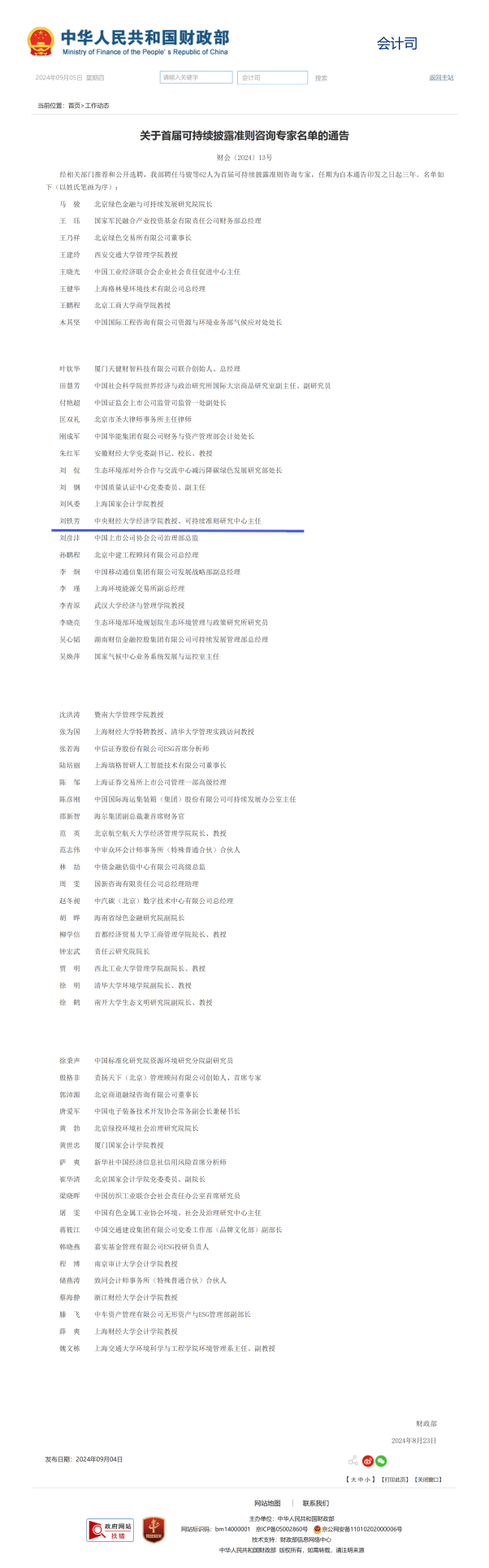 2024年9月4日,财政部公布了首届可持续披露准则咨询专家名单,经相关部门推荐和公开选聘,首届共聘任62名专家学者,任期为三年。我院可持续准则研究中心主任刘轶芳教授,受聘为财政部首届可持续披露准则咨询专家。