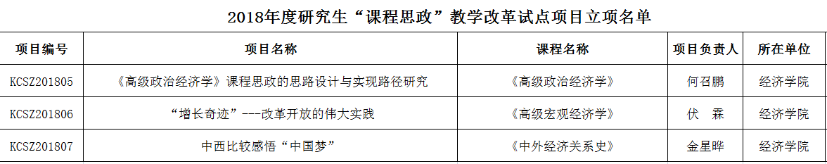 近日,学校研究生院公布了2018年度研究生“课程思政”教学改革试点项目。我院何召鹏老师申报的“《高级政治经济学》课程思政的思路设计与实现路径研究”、伏霖老师申报的“‘增长奇迹’---改革开放的伟大实践”、金星晔老师申报的“中西比较感悟‘中国梦’”获准立项。