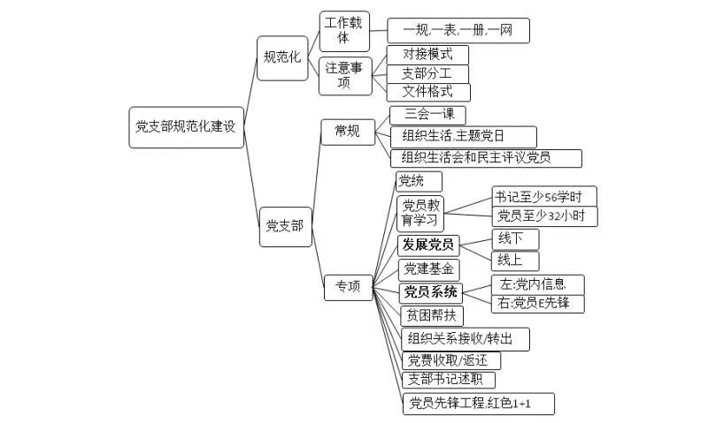 随后,窦老师通过构建思维导图的方式,将“党支部规范化建设”进行拆分。在党支部工作方面,把党务分为常规学习和专项工作两个部分,并对每项工作进行了详细的介绍,督促同学们在完成专项工作的基础上,做好常规的党员学习活动。在规范化建设方面,向同学们形象展示了“一规、一表、一册、一网”的工作载体,接着就支部建设工作提出了具体的要求。