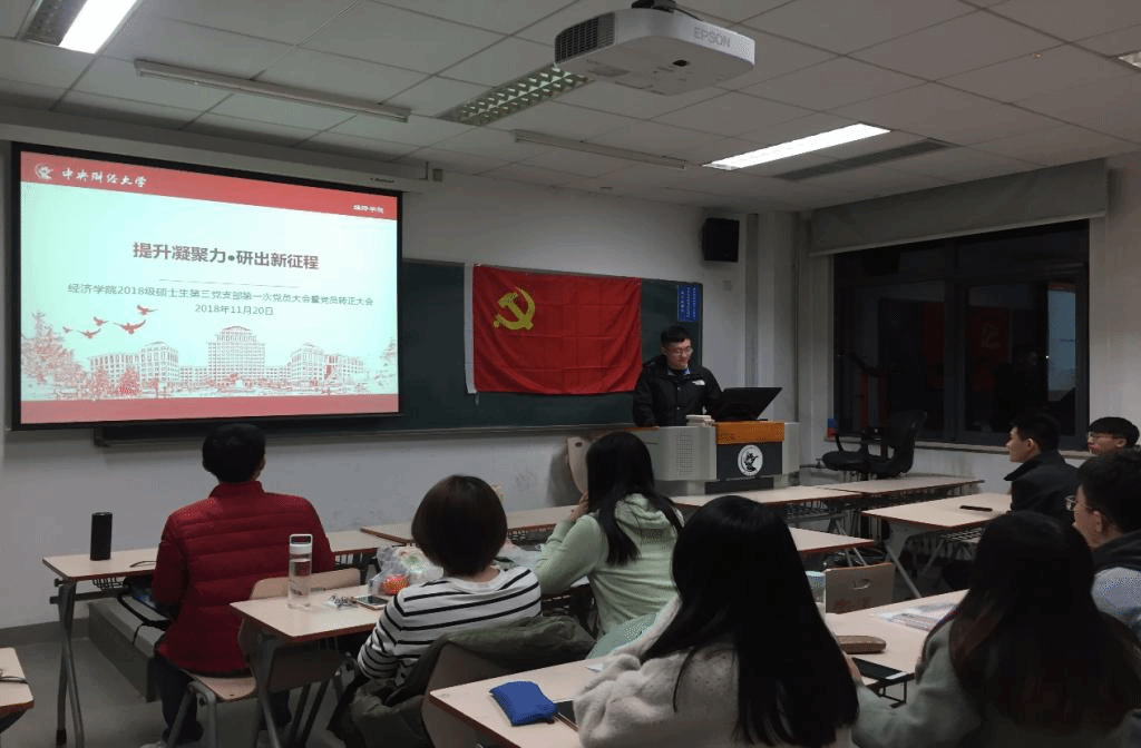 2018年11月20日,我院2018级硕士生第三党支部在中央财经大学沙河校区3号楼219召开了题为“提升凝聚力 研出新征程”的第一次党员大会。会议流程主要分为三项,第一项是关于甘俐俐、张意苓、高倩三位预备党员转为正式党员的转正大会。第二项是支部书记王继彬带领大家学习“全面从严治党”、“榜样3”等优秀视频。第三项是由我们学院2017级硕士生第二党支部书记吴凯学长给大家分享研究生阶段的学习和生活经验。