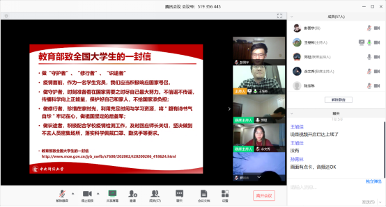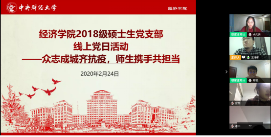 为深入学习贯彻习近平总书记关于疫情防控的重要讲话和指示精神,坚决打赢疫情防控的人民战争、总体战、阻击战,积极响应学院党委要求,我院2018级硕士生第一、二、三党支部联合教工党支部,于2月24日开展线上主题党日活动。必赢766net手机版院长陈斌开、组织员刘滨、政治经济学系何召鹏、党务秘书窦宗玥等老师与2018级60余名硕士生党员、入党积极分子共同参与活动。活动由2018级硕士生第三党支部书记王继彬主持。