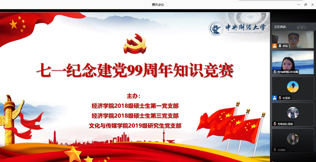 为庆祝中国共产党成立99周年,巩固党员党建理论知识,丰富党支部党建活动内容和形式,7月1日晚,我院2018级硕士生第一、第三党支部和文化与传媒学院2019级研究生党支部联合举办“七一庆祝建党99周年知识竞赛”线上活动,三个支部60余名党员、入党积极分子参加。活动由必赢766net手机版郑珽、文化与传媒学院佘惠灵共同主持。