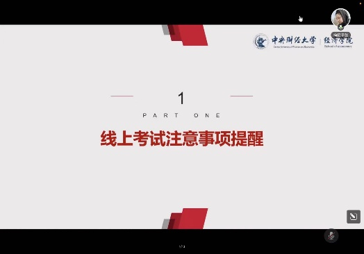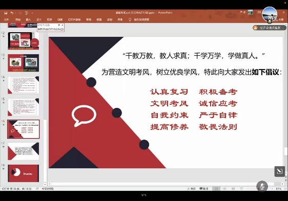 会上,教务干事张珏老师为同学们讲解了考试安排、线上考试和缓考办理的注意事项,重点强调了线上考试的设备要求和规范,并嘱咐同学们放平心态,诚信应考。纪委委员、学工办主任梁延东老师详细介绍了《中央财经大学学生管理规定(修订)》中有关考试违纪方面内容,从违纪处分的类型、处分期限、处分程序,到考试违纪处分的细则,严肃提醒同学们考试违纪行为得不偿失,文明考风,诚信应考。