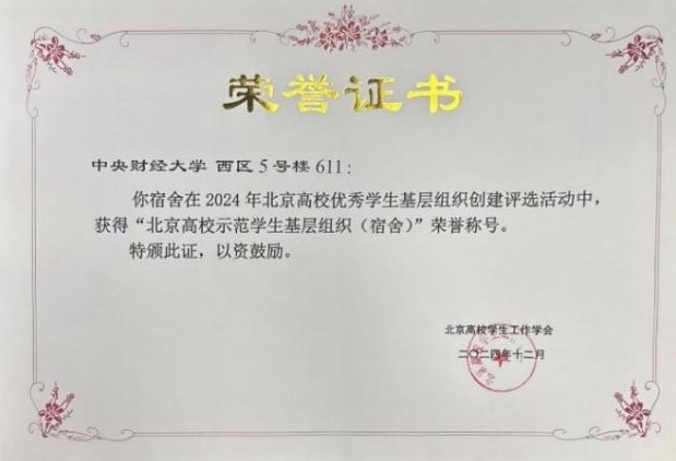 西区5号楼611宿舍荣获“北京高校示范学生基层组织(宿舍)”称号,同样彰显出学院基层建设的扎实成效,宿舍内4位经济学专业同学,在学习科研、社会实践和宿舍文化建设方面表现卓越。大二学年,4人加权平均分均超93分,其中2人累计加权平均分超94分,在经济学专业排名分别为第 1、2、5、9 名。大学两年半期间,4人累计获奖约60 项,其中国家级奖项11项,2 人次获得国家奖学金,2024年该宿舍还被评为中央财经大学优秀宿舍。