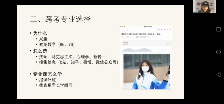 考取我校金融专硕的褚楚,推荐了优质的辅导机构,同时也分享了考研流程以及不同阶段的注意事项。跨考人大应用心理学专业的陶灿,讲述了跨考决策思路以及弥补专业课学习的渠道。