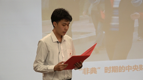 接下来,学生党员代表2018级本科生王天恒、2020级硕士生赵丹宁分别进行了微党课的宣讲。《战“非典”、抗“新冠”,看“保书记”的人民情怀》,王天恒为大家讲述了中央财经大学原党委书记李保仁抗击非典的事迹,“保书记”的付出和贡献深深打动了在场的每一位,并激励着大家要立大志、明大德,打牢专业知识的基础,锤炼好为人民服务的本领,将个人的发展与国家命运紧密相连。