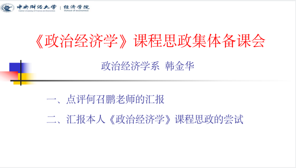 韩金华老师对汇报进行了点评,并结合教学实践,介绍了如何在《政治经济学》及《资本论经济经典著作选读》等课程中实践思政教育。