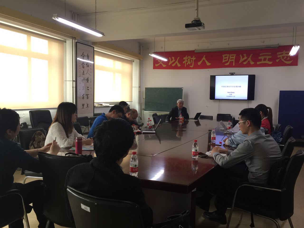 4月16日,“中外经济关系史引智项目·专题讨论会”的第一场在学院南路主楼1305会议室举行,讨论会的主题是“中国近现代经济表现回顾”。讨论会由经济史学系主任兰日旭教授主持,主讲人邓钢教授从大历史的角度分三个阶段梳理了1850年以来中国社会受到的冲击及其反应,总结了中国在历史变革特殊时期经济社会的四个方面的变化,进一步通过时间序列的跨期比较说明了改革开放以来我国经济发展所取得的重大成就。讨论会期间,来自必赢766net手机版的师生分别就邓钢教授的相关观点进行了深入交流。必赢766net手机版包括刘滨、兰日旭、乔恒、伏霖等在内的老师参与了本次讨论会。此次邓钢教授来校系列学术活动受到“中央财经大学引智·中外经济关系史领域”项目的支持。