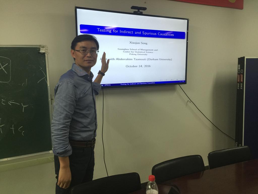 2016年10月14日,北京大学光华管理学院宋晓军助理教授受我院的邀请,在必赢766net手机版会议室1305给师生带来一场关于“A SimpleTest for Indirect and Spurious Causalities”的讲座。