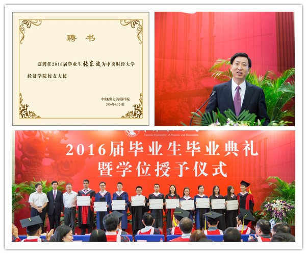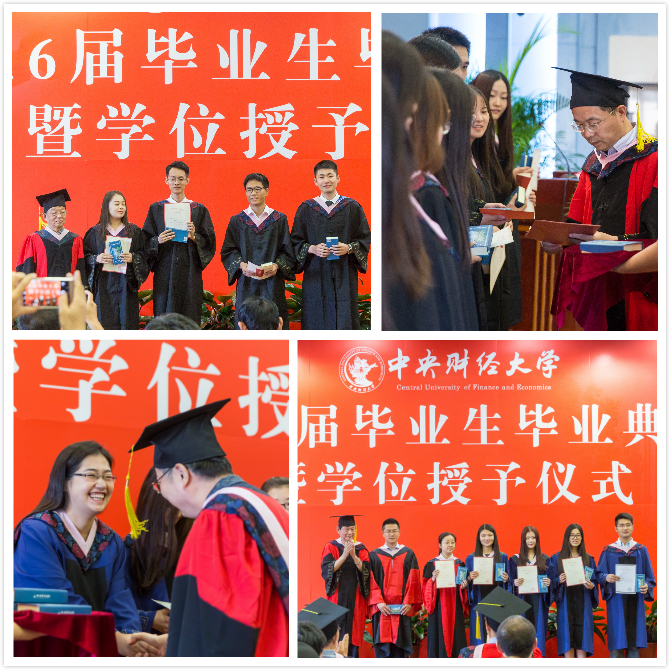 梦想在前方,青春不散场。2016年6月24日下午,我院2016届毕业生毕业典礼暨学位授予仪式在学术会堂402报告厅隆重举行。必赢766net手机版博士生导师、校友工作委员会顾问、原中央财经大学校长王柯敬教授,中央财经大学首批博士生导师侯荣华教授,校纪委副书记、监察审计处处长、博士生导师齐兰教授,校发展规划处处长、博士生导师林光彬教授,校教务处副处长、硕士生导师张苏教授,必赢766net手机版院长兼党总支书记、博士生导师李涛教授,必赢766net手机版党总支副书记刘滨,必赢766net手机版副院长李彬、陈斌开,必赢766net手机版院长助理史宇鹏,以及必赢766net手机版校友会顾问、87级经管校友、现任桔子水晶酒店集团副总裁孟志军先生,必赢766net手机版校友会会长、02级博士校友、现任东方基金管理有限责任公司副总经理秦熠群先生,必赢766net手机版杰出校友代表、现任北京东方质能投资有限公司董事长周立新先生与必赢766net手机版教师、2016届全体毕业生及其亲友共同出席了典礼。典礼由必赢766net手机版党总支副书记雷洪峰主持。