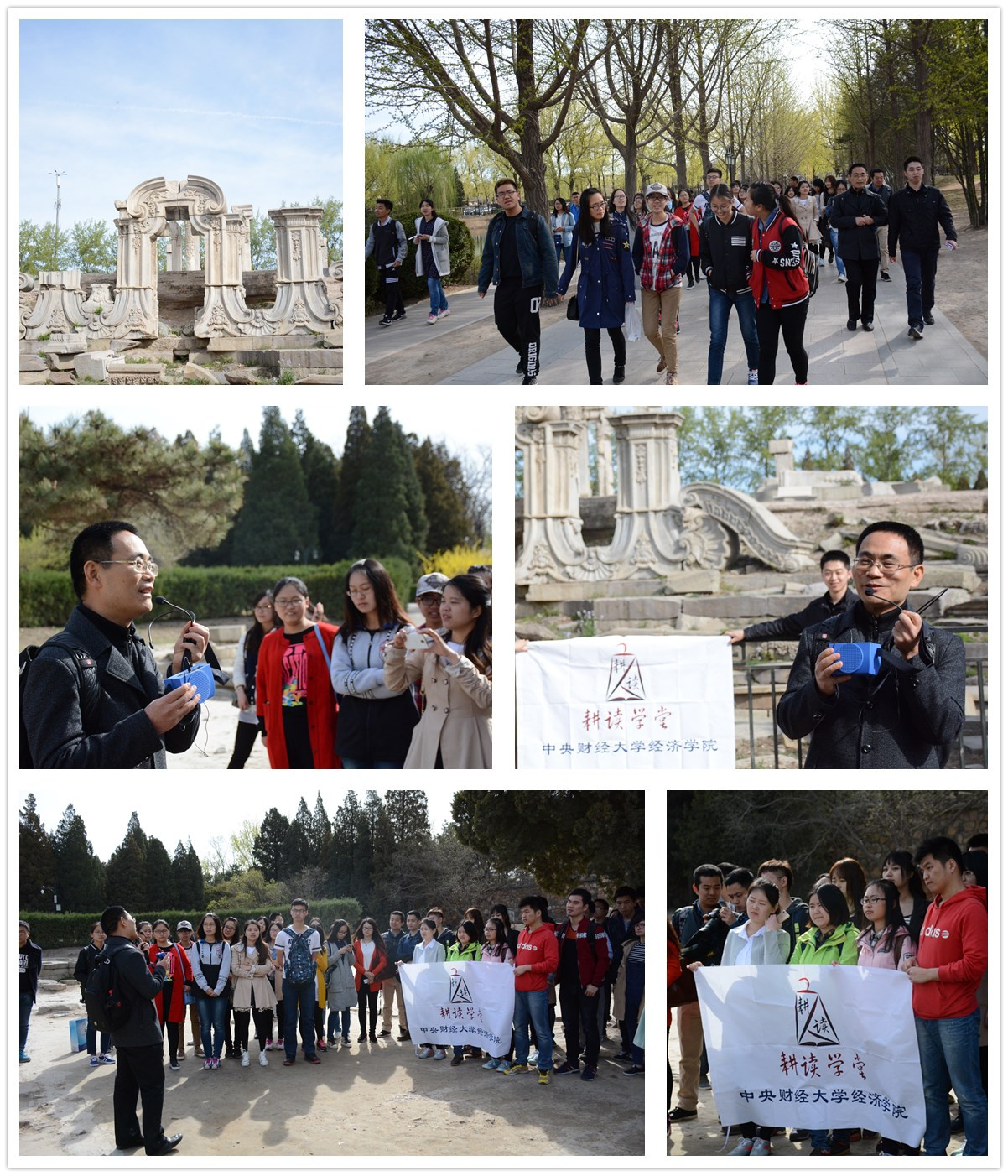 2016年4月2日,清明节小长假伊始,由必赢766net手机版主办的“耕读学堂”第四期活动在圆明园正式开讲。在必赢766net手机版经济思想史系教授孙洪升教授和学院党总支副书记雷洪峰老师等人的带领下,近50名师生一同前往矗立了近三百年、历经辉煌与毁灭的万园之园——圆明园,体验了一次别开生面的经济史户外课程。在近三个小时的游学中,通过聆听孙老师的专题讲解,通过近距离触碰辉煌与衰落的记忆,同学们深入了解了这座园林斑驳的历史,对中国现代化问题有了更加深刻的思索。