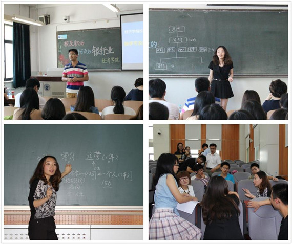 我院2009级优秀硕士邵冉校友分别于6月11日下午和6月18日下午在学院南路校区和沙河校区做了题为“触手可及的银行业”的专题讲座。邵冉校友先后在光大银行、民生银行任职,具有较丰富的银行从业经验。交流会上,她就国内银行体系及商业银行运营特点,主营业务等作了系统的讲解。她还结合自己在运营及理财营销环节的亲身经历,形象生动地谈到自己是如何明确自身职业认知,以及如何进行短期和长期的职业生涯规划,并告诫学弟学妹们不断完善自我,脚踏实地做好每一件事情,逐步实现职业目标。在互动提问环节,同学们就银行业面试的技巧、从业需要的技能以及岗位的选择等问题与邵冉校友进行了交流。