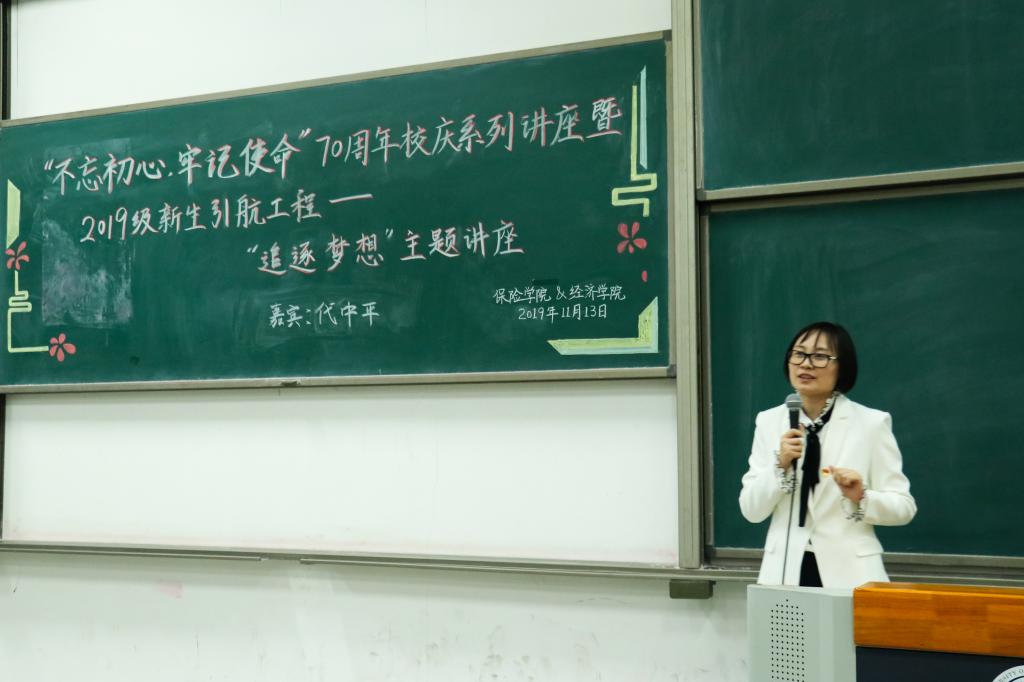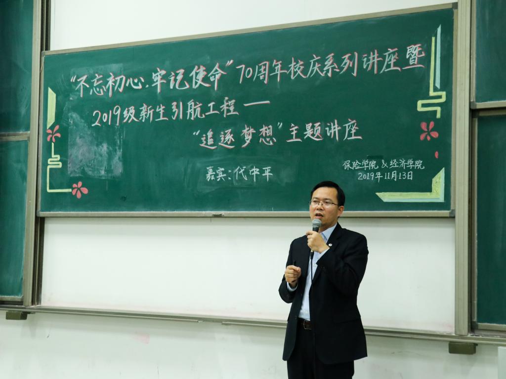 七十春秋写华章,龙马奋进起新航。为响应学校“不忘初心、牢记使命”主题教育的号召,保险学院与必赢766net手机版特别邀请到国投财务有限公司副总经理、国投保险经纪有限公司总经理、中央财经大学校外辅导员代中平为2019级新生开展“追逐梦想”主题讲座,旨在用梦想的力量指引同学们明晰目标、不忘初心,同时积极探索未来道路,不枉四年学习时光。本次讲座同时也是必赢766net手机版润园对话系列活动第二十二讲。