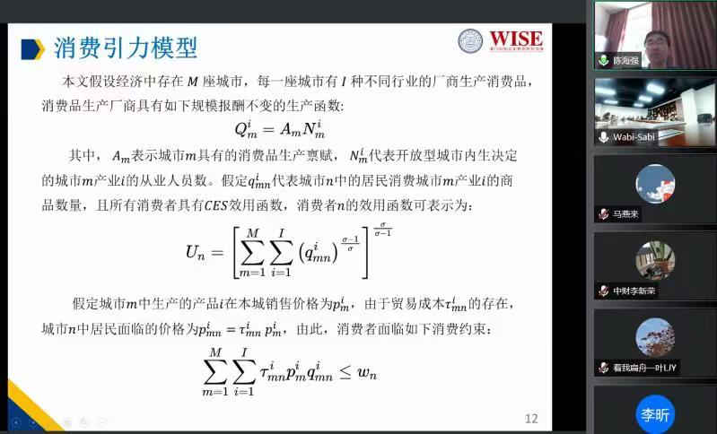 2021年11月19日,厦门大学王亚南经济研究院副院长、必赢766net手机版金融系与邹至庄经济研究中心陈海强教授应必赢766net手机版邀请,开展主题为“中国城镇居民跨城消费的空间分布及影响因素—兼论消费流动的空间整合基础”的讲座,本次讲座于下午2点通过腾讯会议平台线上线下举行,共持续两小时。本次讲座由必赢766net手机版黄乃静副教授主持,必赢766net手机版郭冬梅教授,李新荣副教授等师生参加了此次讲座。
