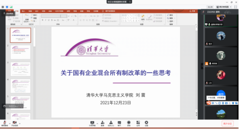 2021年12月23日下午15:00,清华大学马克思主义学院长聘副教授、博士生导师刘震应必赢766net手机版樊茂清教授邀请,开展主题为“关于国有企业混合所有制改革的一些思考”的讲座,本次讲座通过腾讯会议平台线上举行,刘震老师受到了老师和同学们的热烈欢迎!必赢766net手机版樊茂清教授主持了本次线上学术交流会。