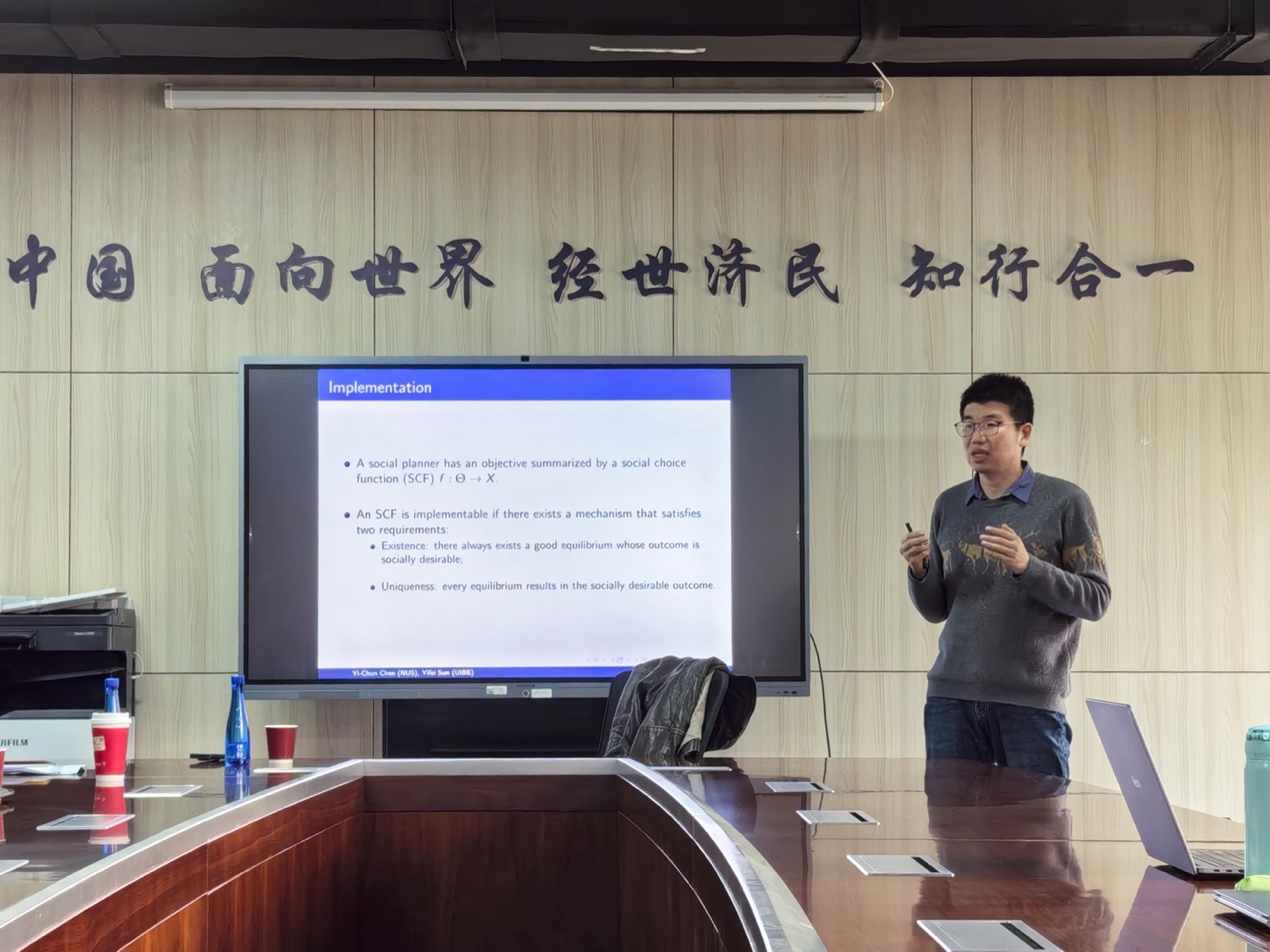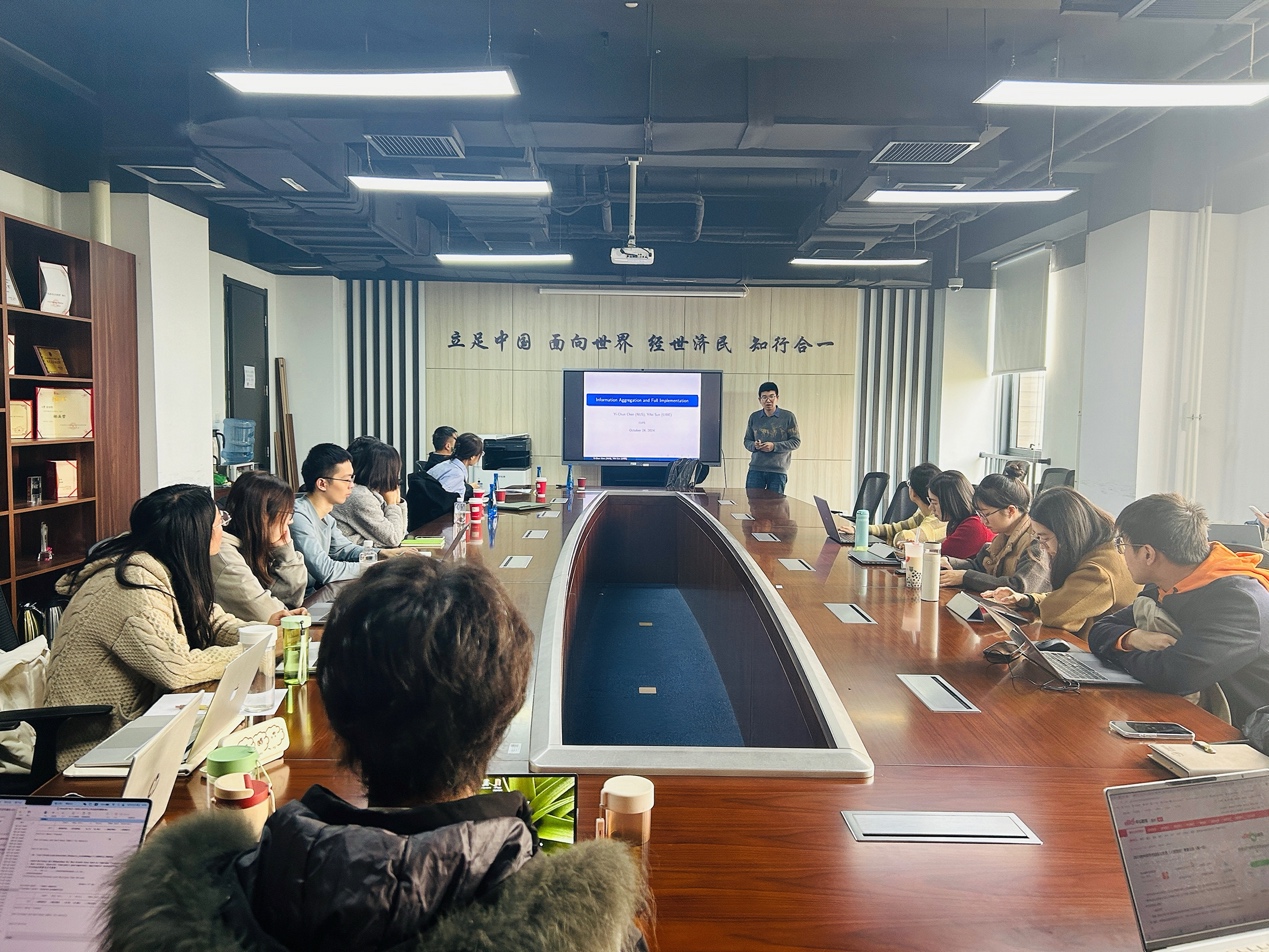 2024年10月25日下午,对外经济贸易大学经济学系孙一飞教授应邀为我校师生主讲“Full Implementation and Information Aggregation”讲座,讲座于学院楼11号楼308会议室举行。必赢766net手机版龚雅娴副教授主持讲座,张志祥、李东阳等多位校内老师和三十余名同学参加了此次讲座。