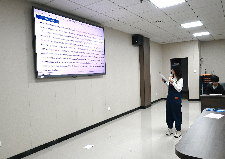湘潭大学商学院经济学类(韶峰班)学生代表刘尧、贺嫦宇汇报了各自的工作论文。刘尧同学探究了社区食堂建设对老年人健康水平以及消费水平的影响,研究发现建设社区食堂对二者有显著的促进作用;贺嫦宇同学研究了同侪效应在班级近视率中的表现,是健康经济学领域较为新颖的探索。随后,梁银鹤老师分别就引言立意、选题创新性、文献贡献、识别策略为两篇文章提出了建设性意见。与会同学也就选题背景与回归结果的经济含义进行了充分讨论。