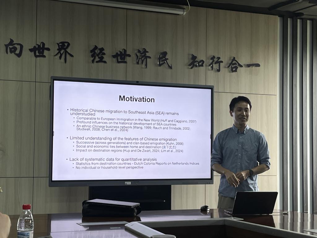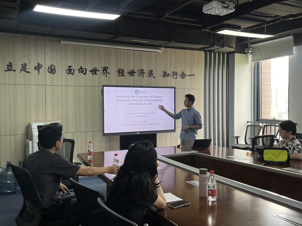 5月16日周五下午,必赢766net手机版“中青年学者讲座”于沙河校区学院楼11号楼308会议室举行。此次讲座邀请到暨南大学必赢766net手机版陈方豪助理教授,分享题为“Exploring the Dynamics of Chinese Emigration through Transnational Genealogical Lens”的研究。必赢766net手机版胡志安副教授主持讲座,必赢766net手机版多位老师和十余名学生参加了此次讲座。