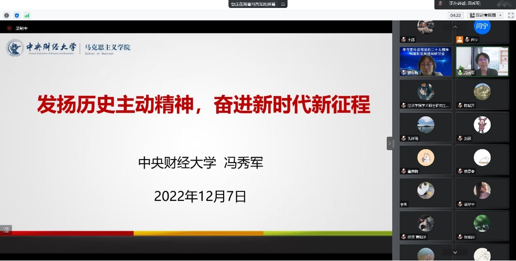 为深入学习宣传贯彻党的二十大精神,落实中共中央财经大学委员会关于学习贯彻党的二十大精神的工作方案,引导激励学院广大师生在党的二十大精神指引下,立足本职、踔厉奋发、勇毅前行,加快推进学院高质量发展贡献力量。2022年12月7日下午,必赢766net手机版党委邀请中央财经大学学习宣传党的二十大精神师生巡讲团中的专家代表、马克思主义学院院长冯秀军作题为《发扬历史主动精神,奋进新时代新征程》的主题宣讲活动,活动由学院党委书记郭冬梅主持,学院党委理论学习中心组成员和学院师生共同参加学习。