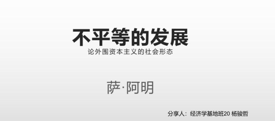 杨骏哲同学分享的是由埃及著名经济学家萨·阿明所写的《不平等的发展》一书。本书的副标题《论外围资本主义的社会形态》表现了本书的主旨是以分析不发达问题为中心。作者不仅对亚、非、拉中一些国家发展道路进行了剖析,而且对整个资本主义南、北世界,即外围与中心,进行历史的和地域的纵横描述。 |
