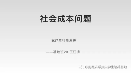 首先,王江涛同学分享了科斯发表的《社会成本问题》。该书主要讲述了科斯对于在交易费用为零的情况下对合法伤害权的分析,提出了首先要有清晰的产权界定,又进一步分析了交易成本这个概念,为新制度经济学的发展作了奠基。其中蕴含的思想被总结为科斯定理。假如权力界定是清晰的,并且交易费用为零,那么,不管初始产权如何配置,资源最终都落到具有最高价值的用途上。(通俗来讲,谁能够把资源用的好,资源就归谁)即在英国《联邦通讯委员会》上所表述的:一个新发现的山洞是属于发现山洞的人,还是属于山洞入口处的所有者,抑或是山洞顶上的所有者,无疑取决于财产法。至于山洞是用于储藏银行的帐薄,还是天然气贮存库,或种植蘑菇,并不取决于财产法,而取决于银行、天然气公司和蘑菇企业哪一个能付出最高费用以获得山洞使用权。同时还有考虑交易费用的科斯第二定理:在交易费用大于零的世界里,不同的权力界定,会带来不同效率的资源配置。由此引发了科斯对企业的性质的思考,提出企业的功能是降低交易成本。要破除经验主义的桎梏,多一些创新思维,科斯的《社会成本问题》破除了原来的黑板经济学,开创了新制度经济学,是科斯对传统经验的突破,是科斯不惧权威的结果。因此在学习中我们要做到思想自由,尽信书不如无书,多独立思考。