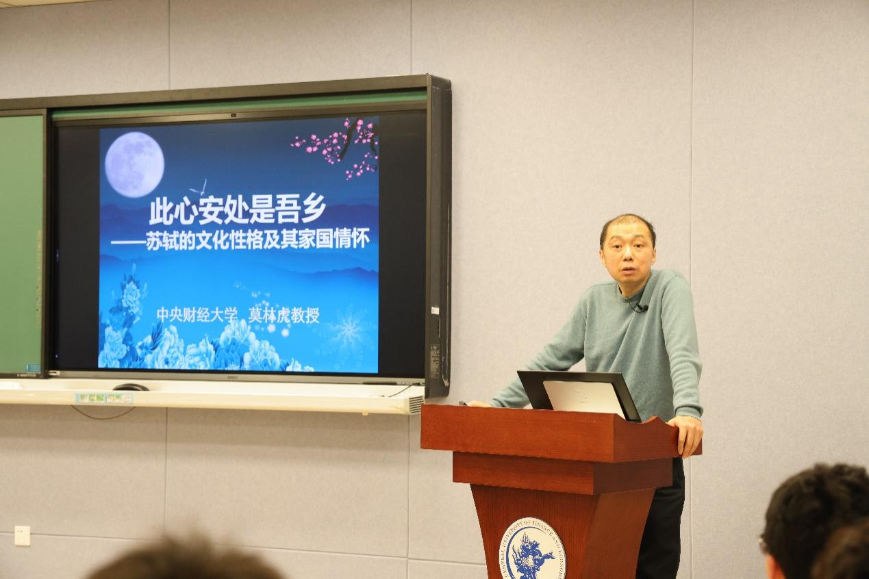 2024年11月20日下午,数字经济时代经济学拔尖学生培养基地在沙河校区6号学院楼107教室举办“明德至善通识课程讲座”。基地邀请中央财经大学文化与传媒学院的莫林虎教授,举办以“此心安处是吾乡——苏轼的文化性格及其家国情怀”为主题的讲座。
